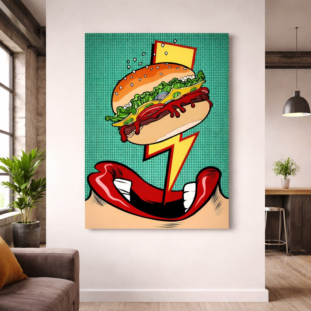 Très beau Tableau Design mettant en valeur un Cheeseburger. Décorative et bien pensée, laisse toi tenter par cette Oeuvre qui sublimera l'une de tes pièces avec Style !